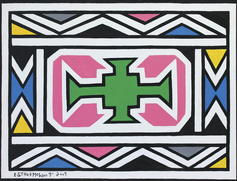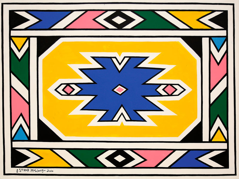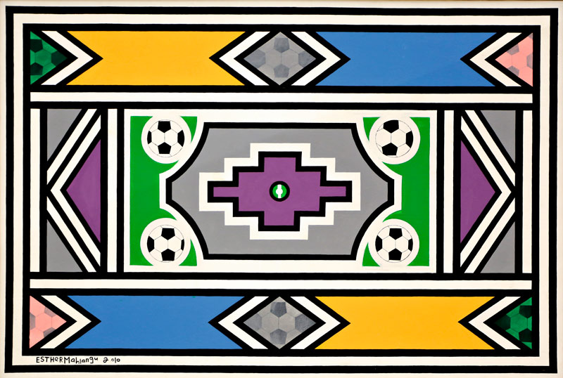 Her expressive language comes from the tradition of decorating the houses on particular ritual occasions, which is still transmitted from one generation to the next by women of the villages of the Ndebele people, to which she belongs. Her paintings are characterized by the presence of repeated geometric shapes bound by a thin black border and from the combination of them sometimes stylized figures and object emerge, enhanced by vibrant monochrome-filled backgrounds. Her sculptures resonate the fetishes and the magical- propitiatory handcraft productions.